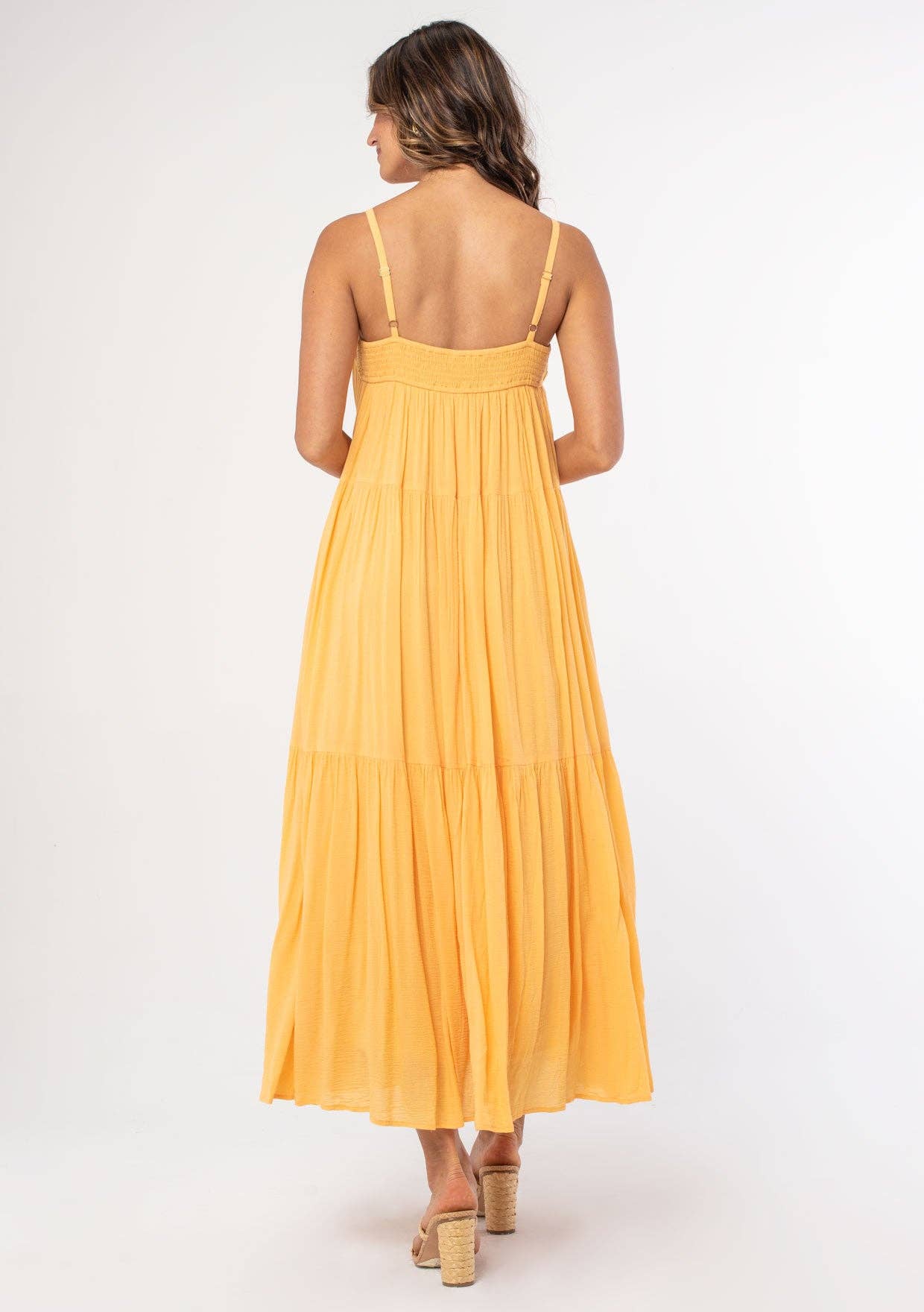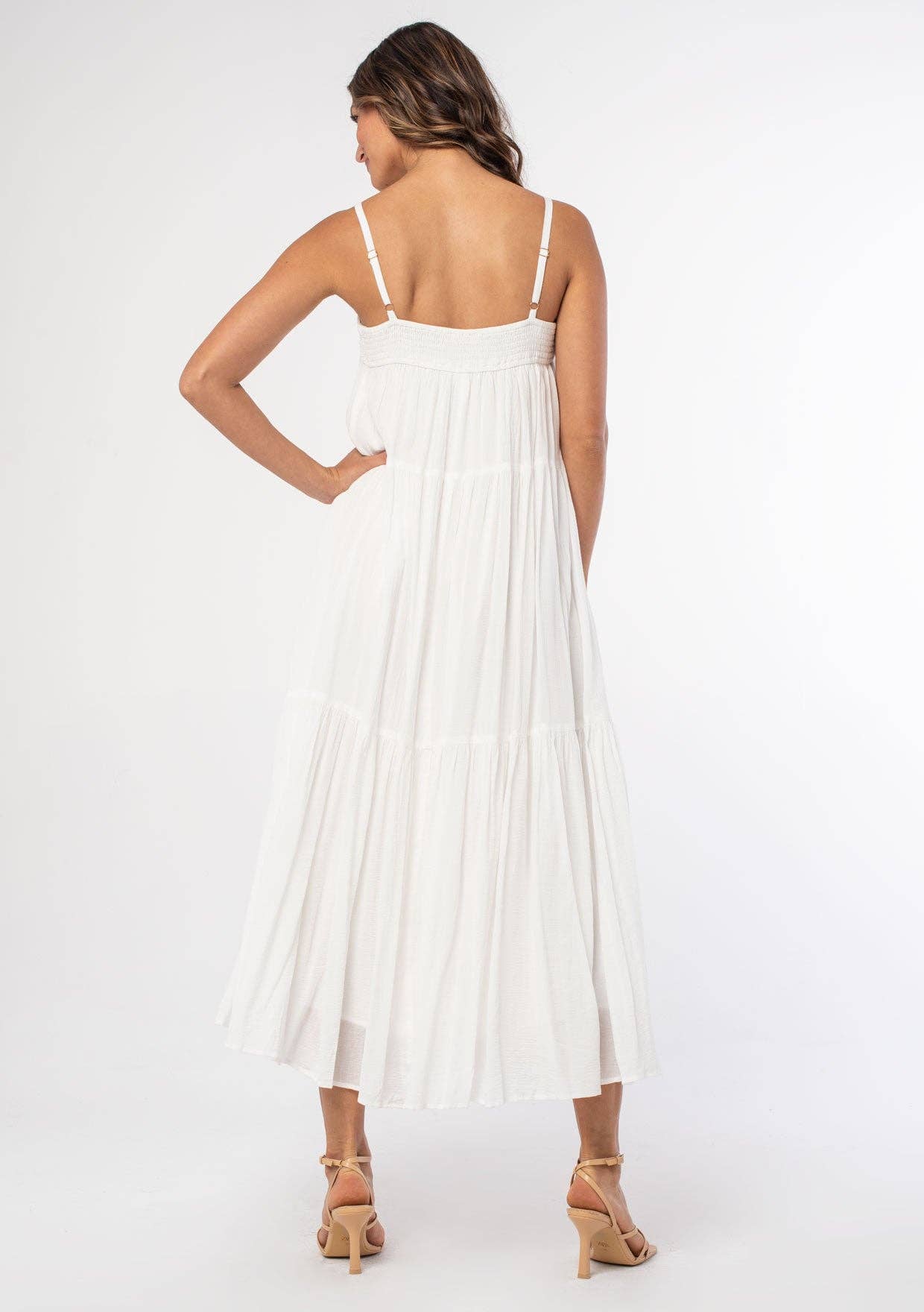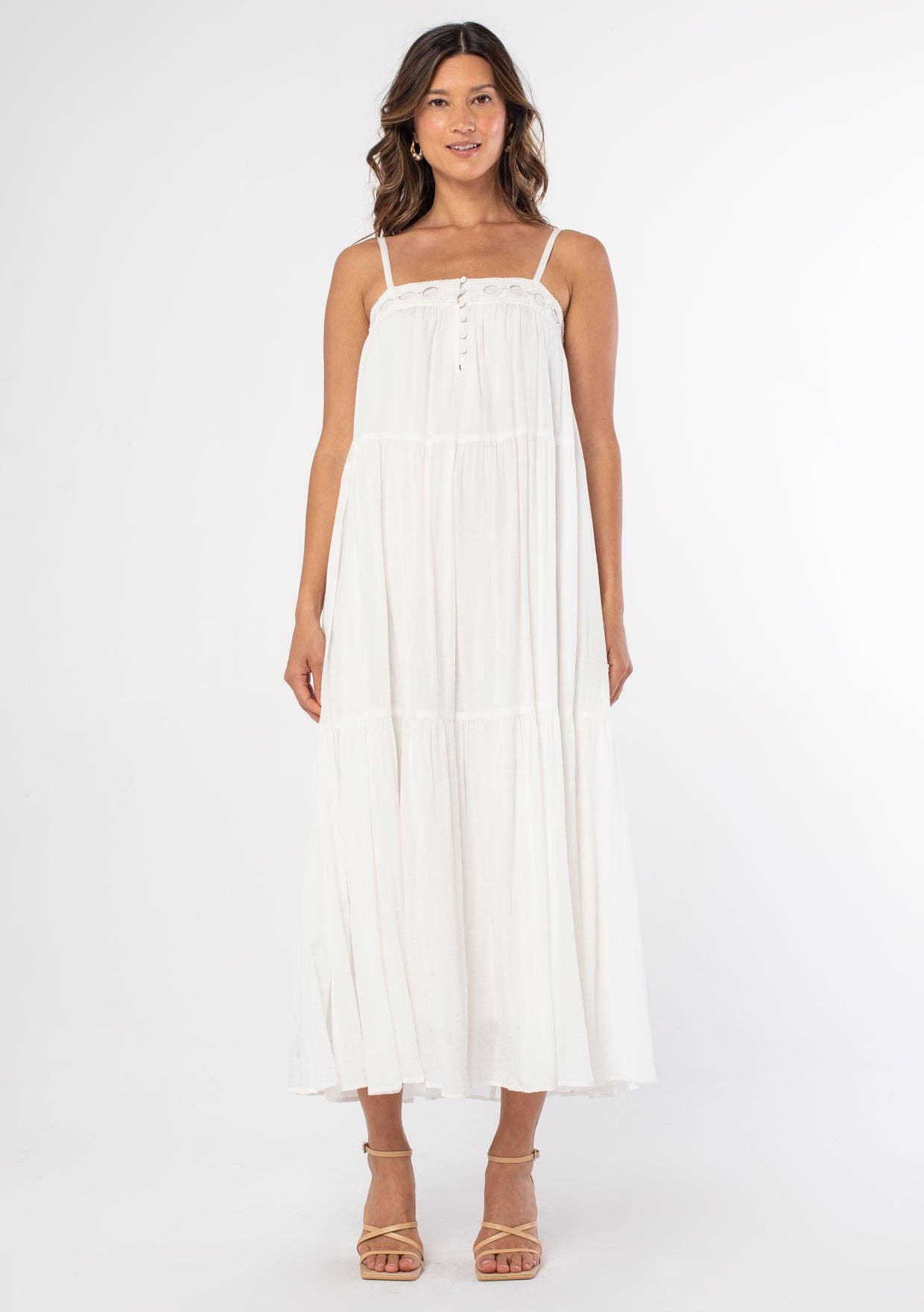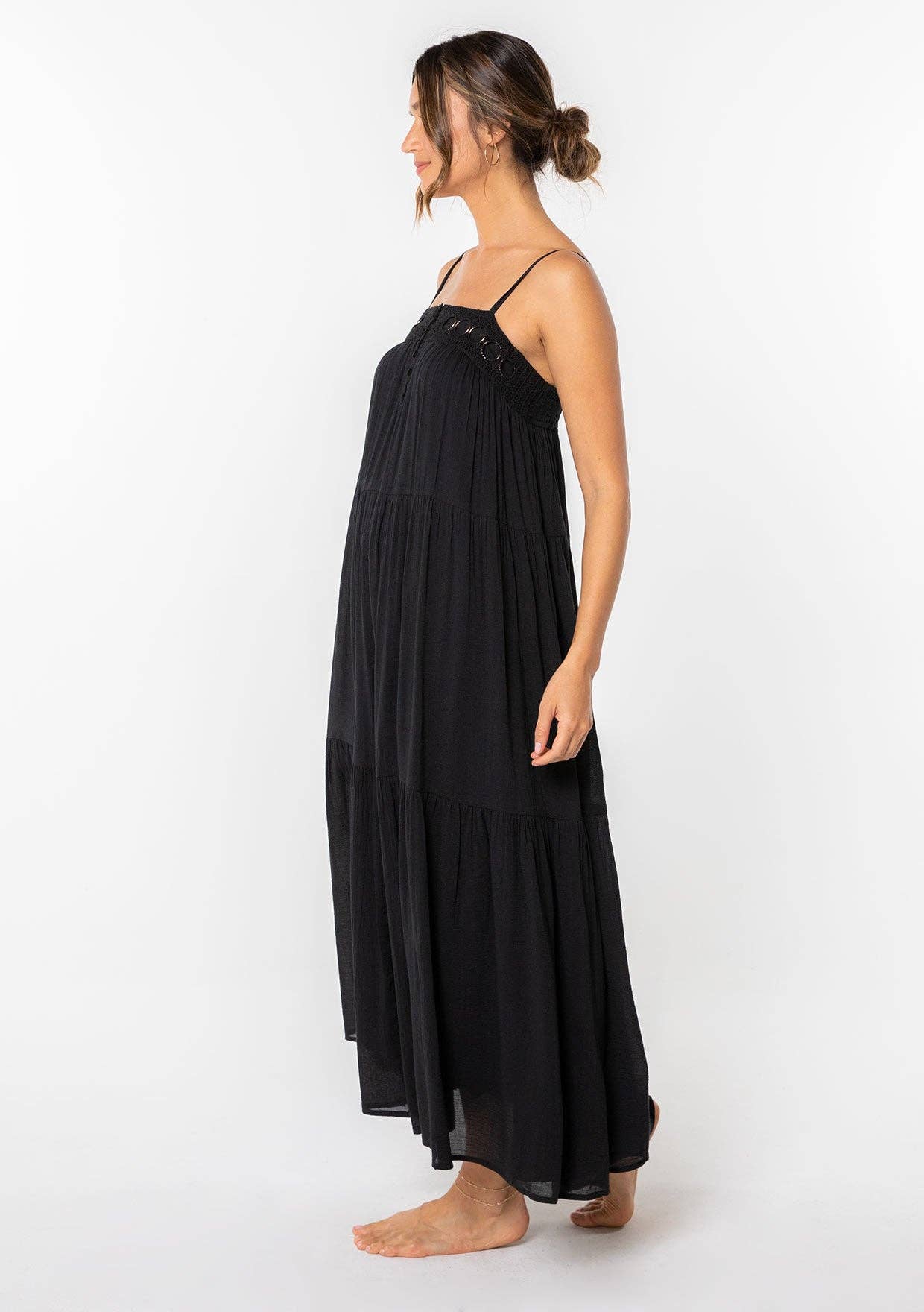 Bohemian tiered maxi dress with adjustable spaghetti straps and a functional button front. Features beautiful crochet trim details on top. This trapeze-style maxi is perfect for summer vacation.